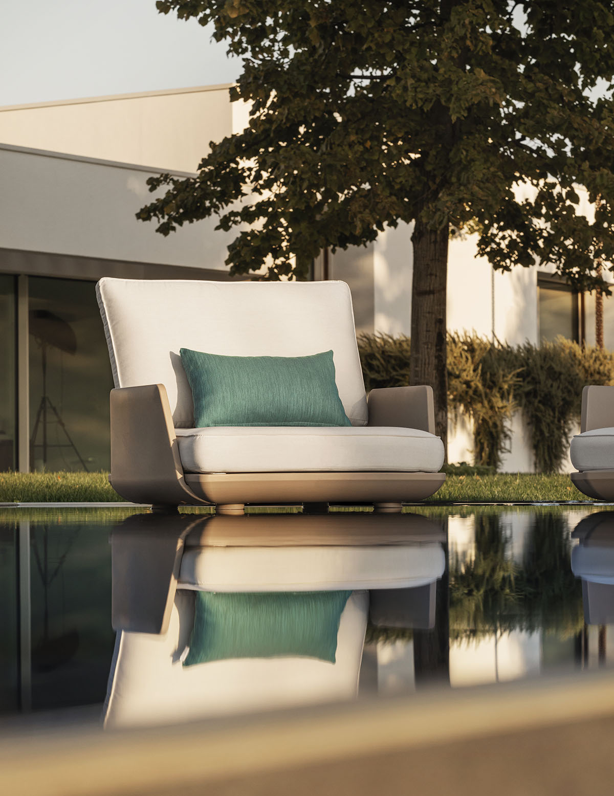 Sessel sind als eigenständige Sitzobjekte konzipiert, die sowohl funktional als auch formal überzeugen. Ihre Proportionen bieten Komfort, ohne dabei visuelle Schwere zu erzeugen. Die Materialwahl unterstützt den dauerhaften Einsatz im Freien und sorgt für eine angenehme Haptik. In ihrer reduzierten Form ergänzen sie unterschiedliche Aussenräume auf zurückhaltende Weise.