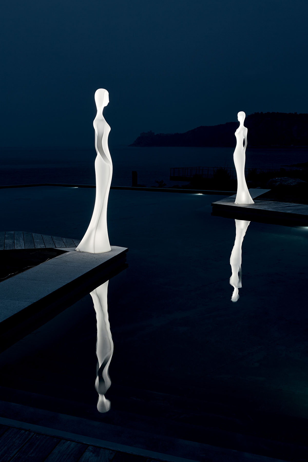 Lampen von My Your sind als skulpturale Objekte für den Aussenraum konzipiert. Ihre schlanken, teils organischen Formen verleihen ihnen eine eigenständige, fast künstlerische Präsenz – sowohl bei Tag als auch bei Nacht. Das Licht dient nicht nur der Funktion, sondern betont die Silhouetten und schafft eine klare Atmosphäre im Raum. Gefertigt aus wetterbeständigen Materialien verbinden sie technische Qualität mit einem ausdrucksstarken, ungewöhnlichen Design.